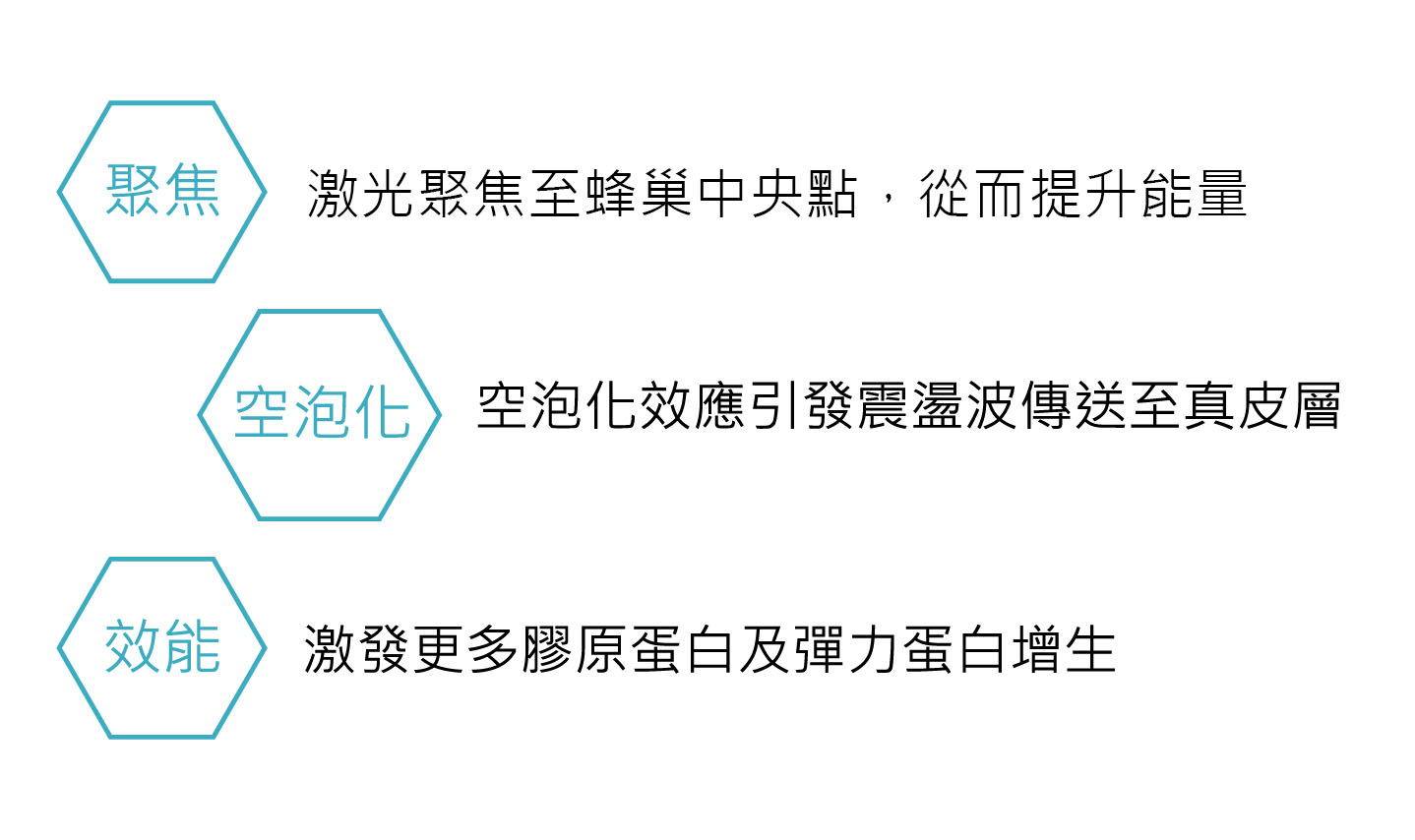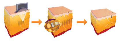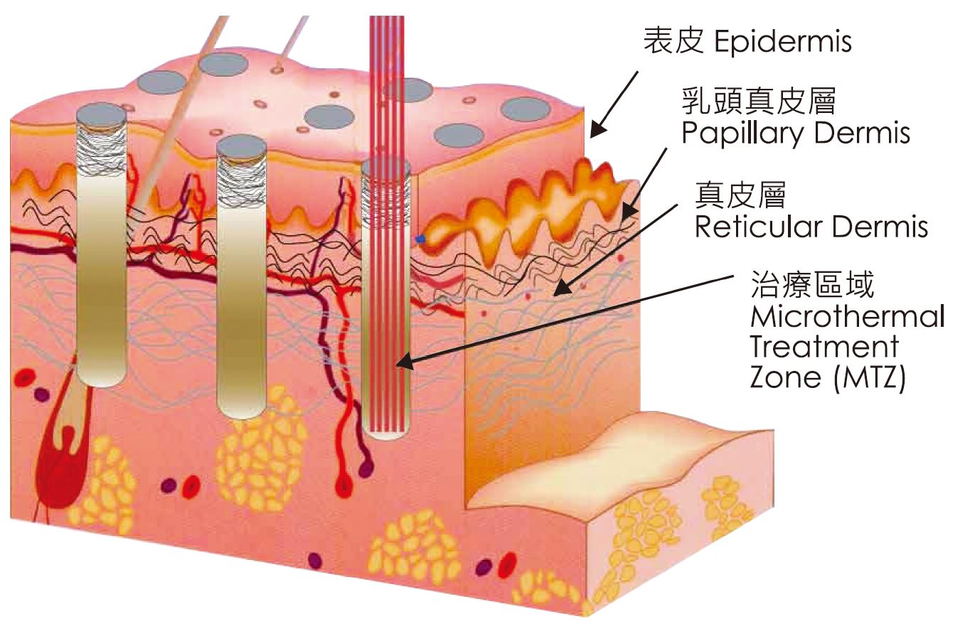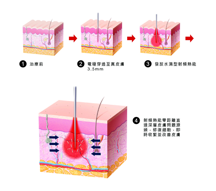 RF探頭發出較高頻率的電磁波(40MHz,每秒4千萬次),皮膚深層組織的水分子會因探頭發出的電磁波作用而快速旋轉及振盪,產生適當的熱能,熱能只會集中於皮膚的深層。於療程中,只會感到溫熱的感覺,並不會有任何疼痛,無創傷性地激發肌膚重生,全面提升肌膚質素。