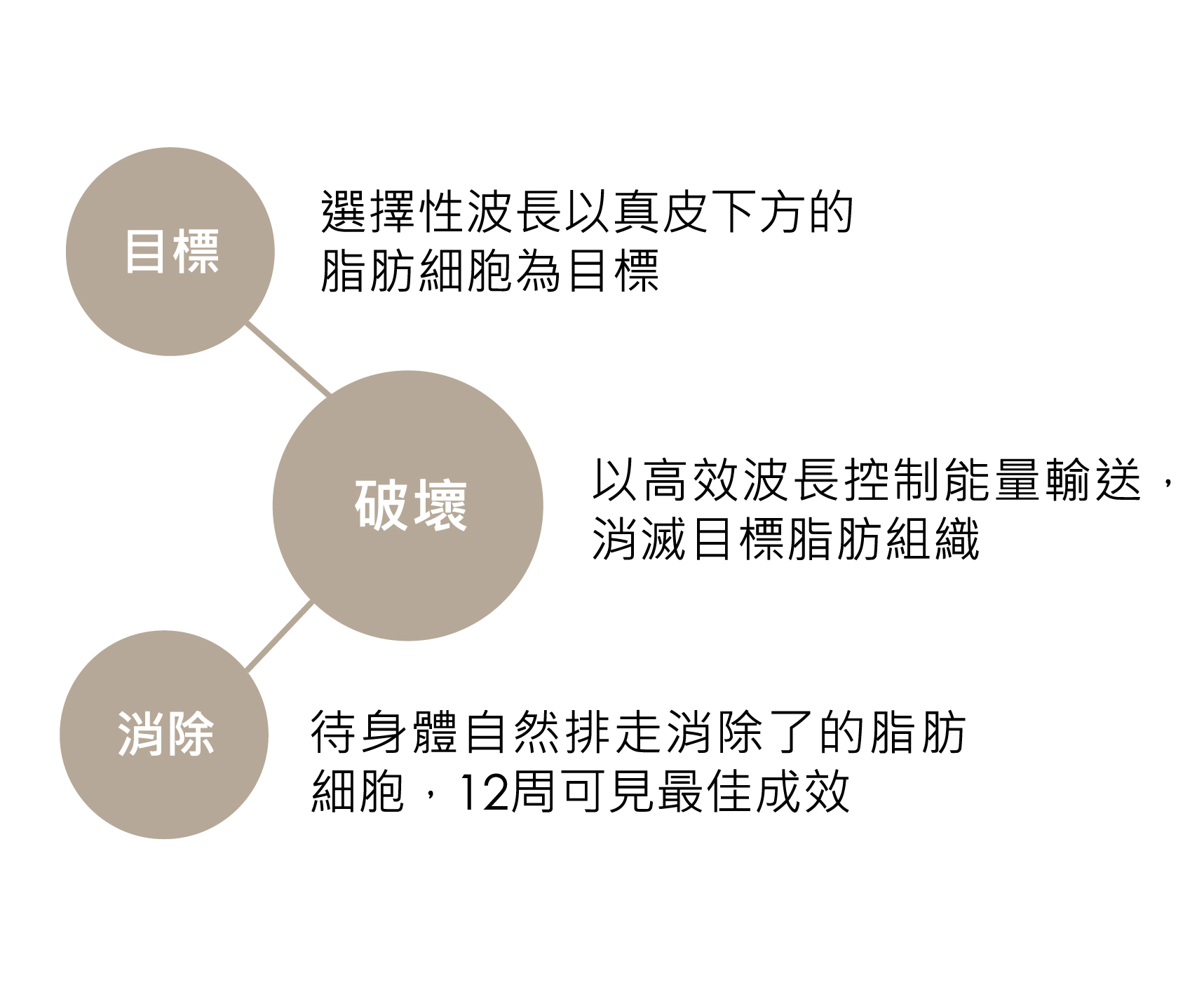 首先會評估和標示出最多4個療程部位,然後將4個平面接觸頭*固定於療程部位。開始進行25分鐘的療程,利用1060nm能量將目標溫度提升至42-47度以破壞脂肪細胞。完成療程後即可恢復日常生活。